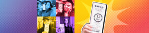 Two men are looking excitedly at the phone help by the man on the left. They appear to be cheering at the image or video they're watching. Around the men are football-themed illustrations