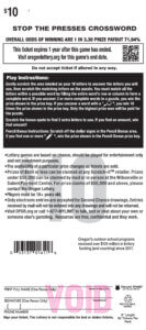 Hold the front page! You’re in control of the breaking story with Stop the Presses Crossword. With each scratch, uncover letters and work to complete words that could lead to exciting prizes. Plus, you get an extra twist — the Pencil Bonus game, with four chances for an instant win! At just $10 a ticket, this crossword challenge offers plenty of action and a shot at a $100,000 top prize. Don’t wait for the evening edition; grab Stop the Presses Crossword at your nearest Lottery retailer and see if you’ll be today’s big news story!More quick facts