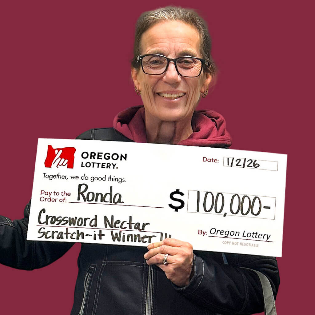 Ronda from Sutherlin decided to stop at the Center Market after work to get snacks and a few Oregon Lottery Scratch-its. Once she was home, she started to watch TV, unwind, and play her tickets. After scratching off the $10 Crossword Nectar, and checking the ticket over and over, she realized she had completed 12 words for the top prize of $100,000! She made her trip to the claim center on January 2nd, first in line to get one of the first prizes of 2026! Here’s to hoping that the rest of her year will be just as lucky.